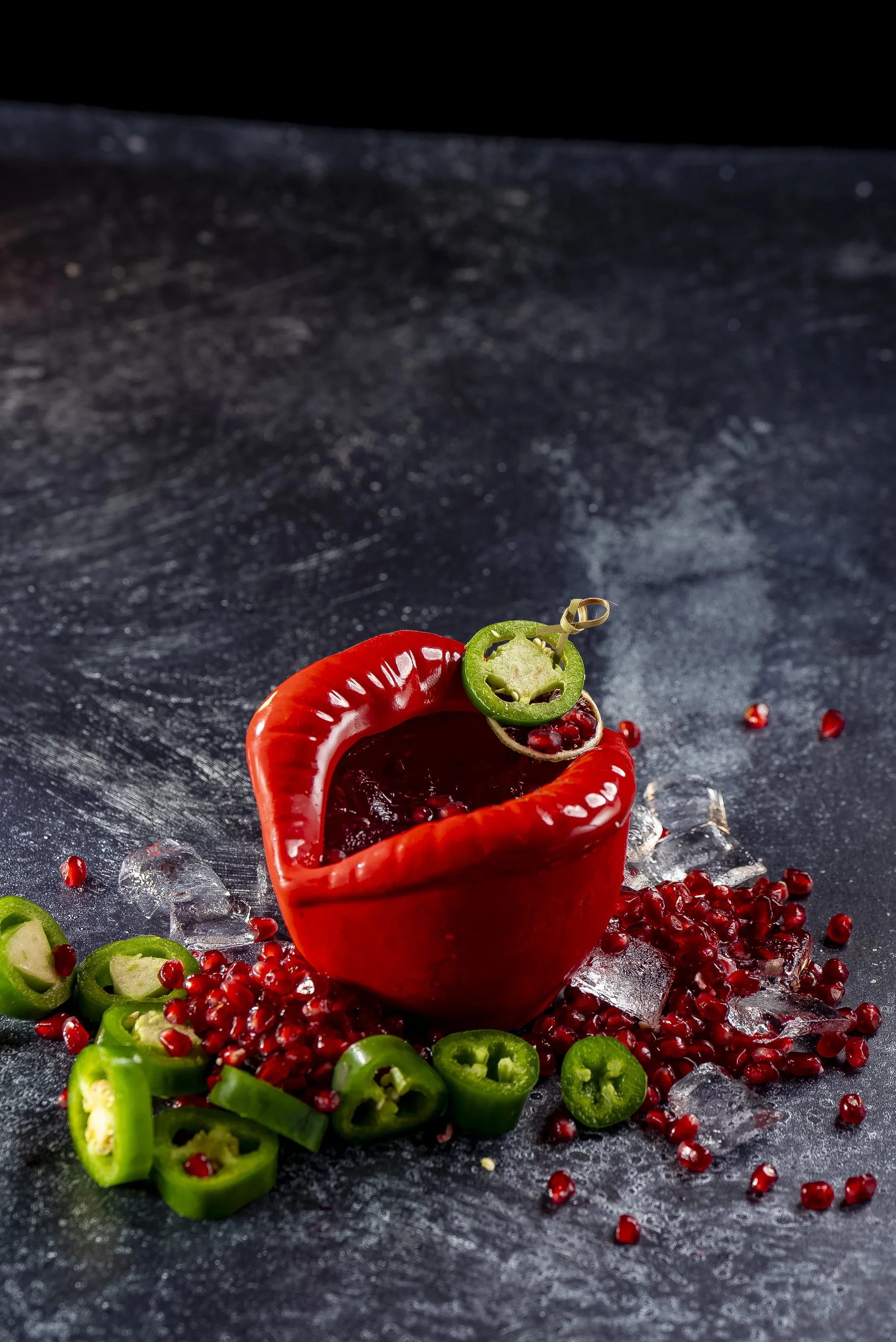 mezcal / pomegranate liqueur / pomegranates / lime / jalapeño